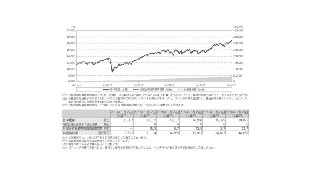 騰落率(基準価額:ベンチマーク騰落率) | 2023年1月:2.7% 2024年1月:22.7% 2025年1月:18.1% |